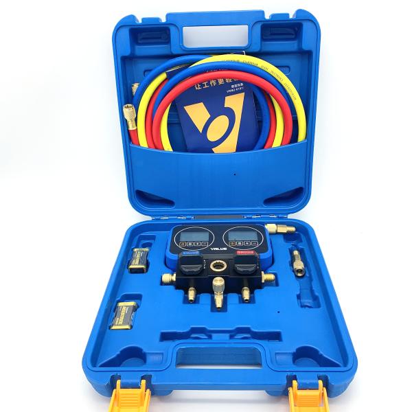 Двухвентильный манифольд с шаровыми вентилеми и складывающим крюком НА МАГНИТЕ на все газы включая R-32, 1234YF, R-290.